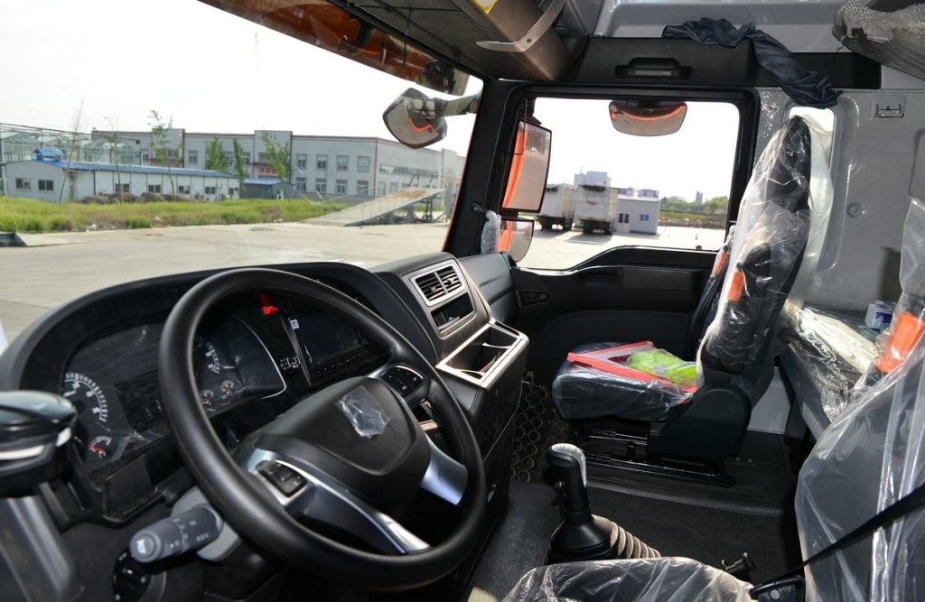 The ergonomic cab prioritizes driver comfort with an air-suspended seat, adjustable steering column, and climate control. A 10-inch touchscreen integrates GPS navigation, real-time traffic updates, and vehicle diagnostics, enhancing route planning and safety. The cab’s noise-insulated design reduces driver fatigue during long shifts, improving overall productivity.